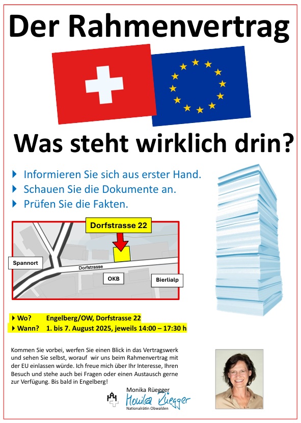 Kommen Sie vorbei, werfen Sie einen Blick in das Vertragswerk und sehen Sie selbst, worauf wir uns beim Rahmenvertrag mit der EU einlassen würden. Ich freue mich über Ihr Interesse, Ihren Besuch und stehe auch bei Fragen oder einen Austausch gerne zur Verfügung. Bis bald in Engelberg!