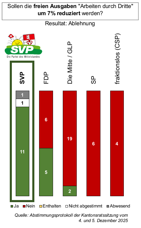 Im Budget 2025 hatte der Kantonsrat noch eine Kürzung von CHF 800’000 für Arbeiten durch Dritte und Honorare externer Berater vorgenommen. Für das Jahr 2026 akzeptiert das Parlament in diesen Positionen den Voranschlag der Regierung, obwohl er bereits wieder um CHF 100’000 höher liegt als im Budget 2025 vor der Kürzung. Mit einem SVP-Antrag zur Reduktion der freien Ausgaben durch Dritte im Umfang von 7% der Gesamtsumme hätte man wenigstens auf dieses Niveau zurückfahren können. Er wurde, wie alle unsere Anträge, abgelehnt.