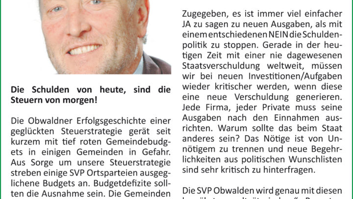 Auch das Budget 2014 wird ein Defizit vorsehen; das sechste in 7 Jahren. Eine Steuererhöhung wird unumgänglich sein. Das alles als Folge der Aufgaben, die laufend auf die Gemeinden überwälzt werden (z.B. Pflegefinanzierung) und als Folge ungeschickter Beschlüsse auf Gemeindeebene.