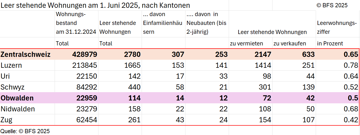 Der Wohnungsmarkt in Obwalden bleibt angespannt. Ende 2024 lag die Leerwohnungsquote bei lediglich 0,5 Prozent und damit deutlich unter dem Schweizer Durchschnitt von 1,0 Prozent. Nur in wenigen Kantonen ist das Wohnungsangebot pro Einwohner noch knapper: In Genf (0,34 %), Zug (0,42 %) und Zürich (0,48 %) standen anteilsmässig noch weniger Wohnungen leer. Obwalden zählt damit zu den Kantonen mit dem geringsten verfügbaren Wohnungsangebot.