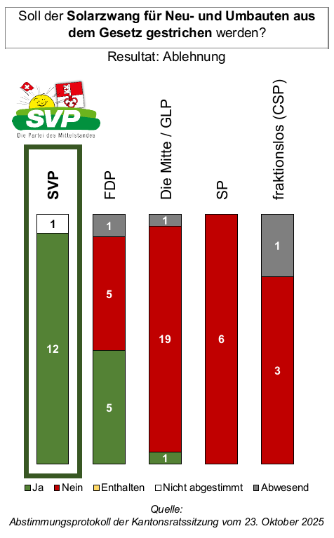 Die SVP Obwalden ist gegen eine Verschärfung der bundesgesetzlichen PV-Pflicht, diese Verschärfung muss aus dem kantonalen Gesetz wieder gestrichen werden. Zudem hat am 13. Juni 2021 das Stimmvolk von Obwalden mit 64% Nein-Stimmen das CO2-Gesetz klar abgelehnt. Diese Verschärfung wurde gegen den Volkswillen von unserem Parlament trotzdem eingeführt. Wir stehen für Technologieoffenheit statt Zwang und für eine Energiepolitik mit Augenmass – im Interesse der Bevölkerung und der Versorgungssicherheit.