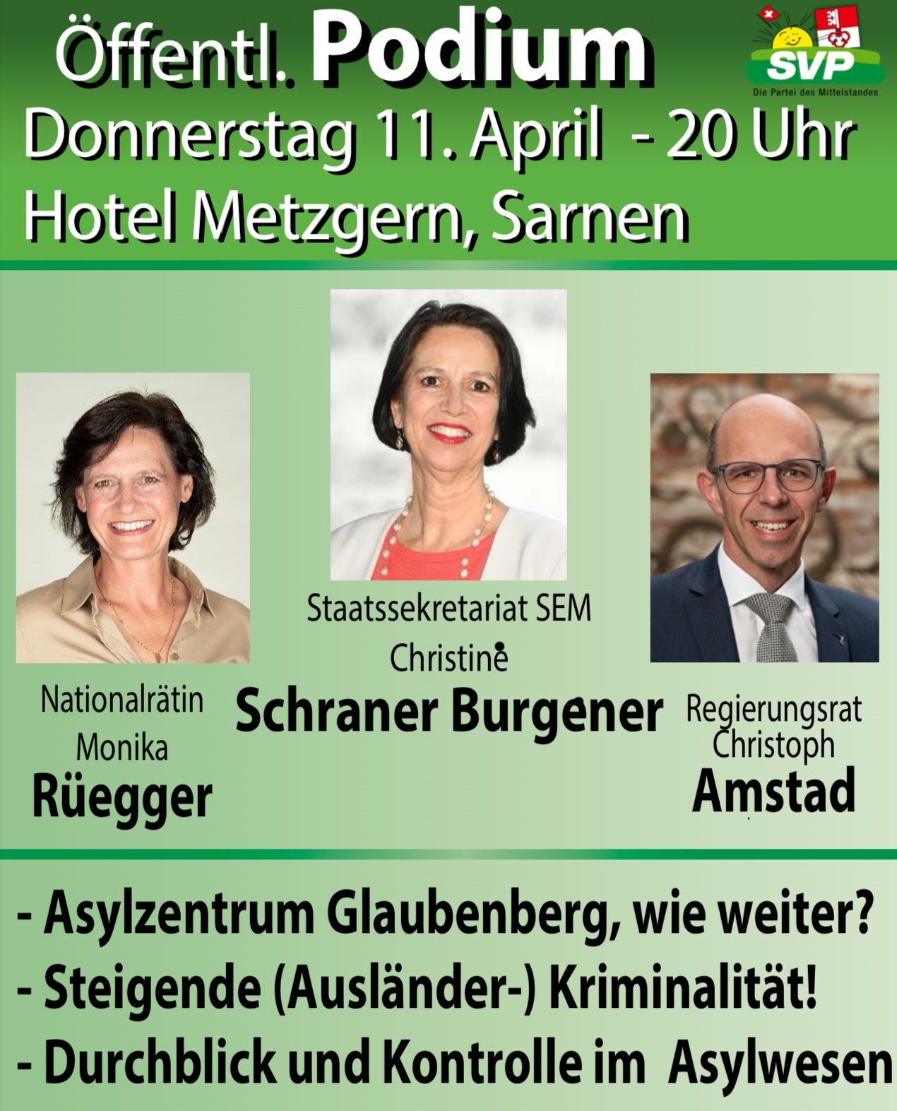 Am Donnerstag 11. April 2024 führte die SVP Obwalden zusammen mit Nationalrätin Monika Rüegger in der Metzgern in Sarnen ein öffentliches Podium zum Thema Schweizer Asylwesen, insbesondere auch zum Bundesasylzentrum Glaubenberg, durch. Das Interesse der Obwaldner Bevölkerung war gross, wir durften über 200 Gäste an diesem Abend begrüssen. Die SVP Obwalden bedankt sich bei Frau Staatssekretärin Christine Schraner Burgener sowie bei Regierungsrat Christoph Amstad für die Bereitschaft, der Obwaldner Bevölkerung Rede und Antwort zu stehen.