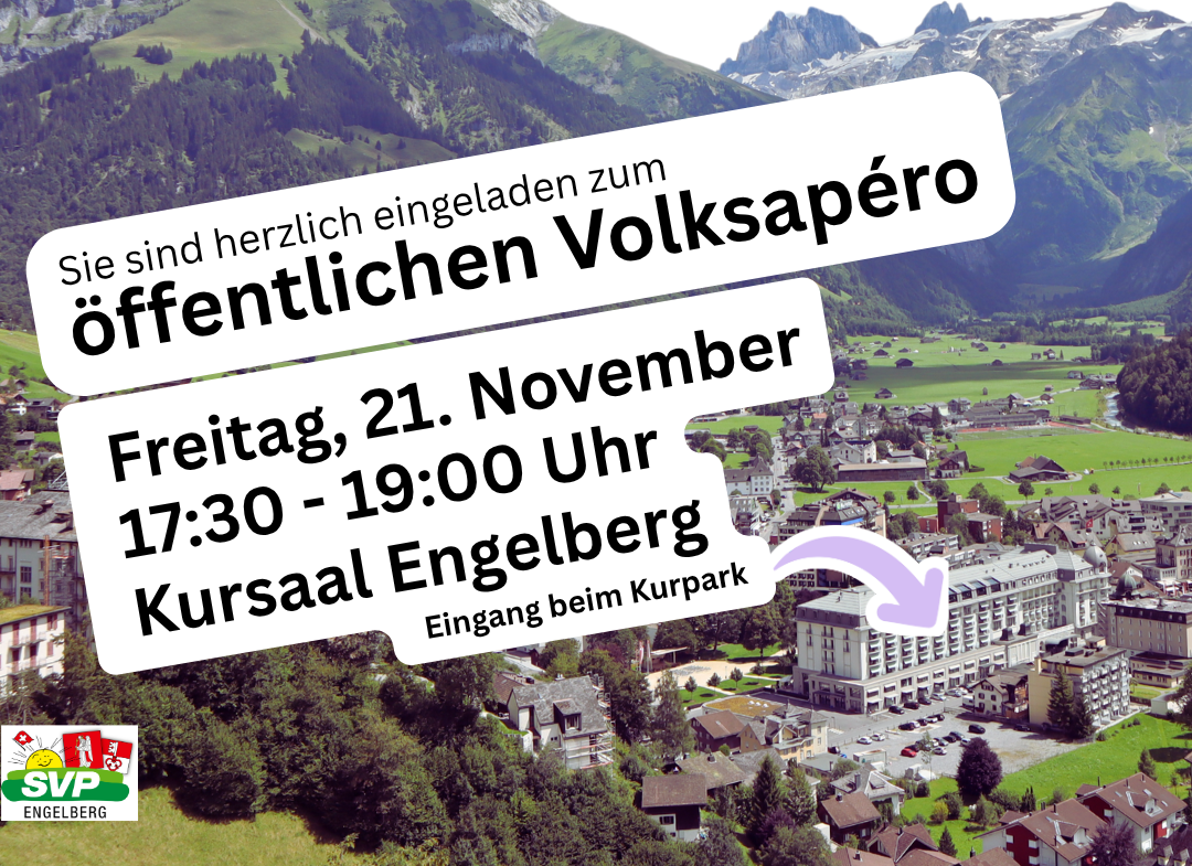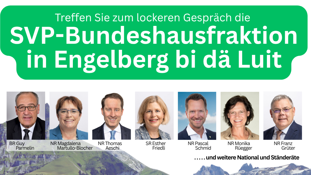 Alle interessierten Bürgerinnen und Bürger sind herzlich eingeladen, sich bei einem Apéro mit der SVP-Bundeshausfraktion auszutauschen. Anlässlich ihrer Fraktionssitzung weilt die Fraktion der SVP Schweiz mit ihren National- und Ständeräten und Bundesrat Guy Parmelin in Engelberg!