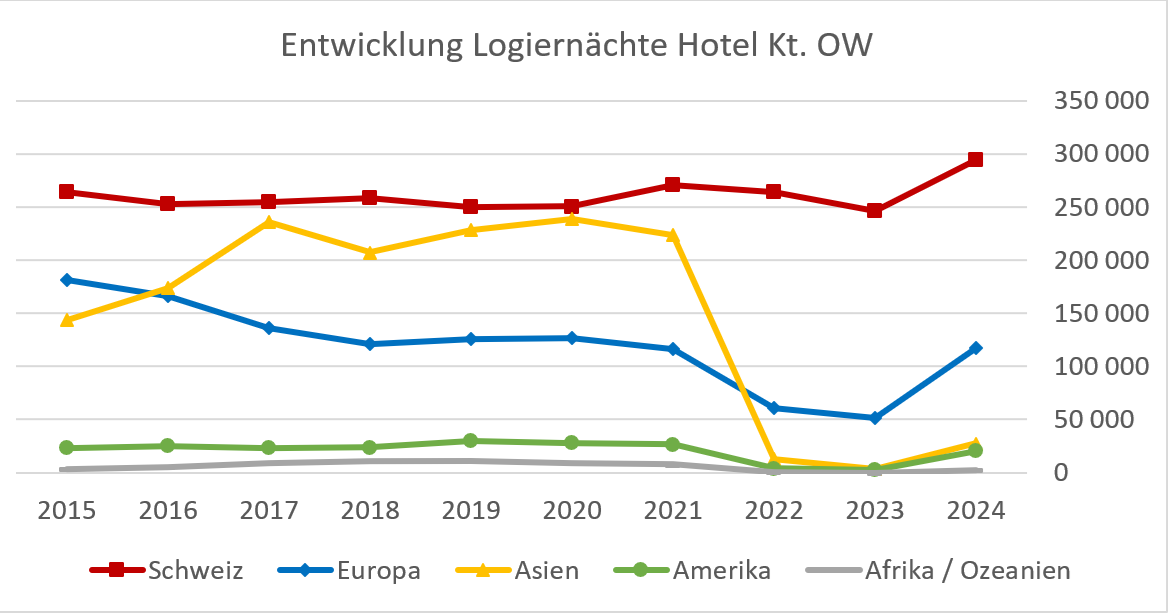 Engelberg bleibt gleichzeitig das international stärkste Aushängeschild Obwaldens. 2024 wurden dort 328’506 Logiernächte gezählt – 42% aller Gästen sind aus der Schweiz, 58% aus dem Ausland. Für die lokale Wirtschaft sind diese Übernachtungen zentral: Hotels, Gastronomie, Bergbahnen, Sportanbieter und der Detailhandel profitieren direkt.