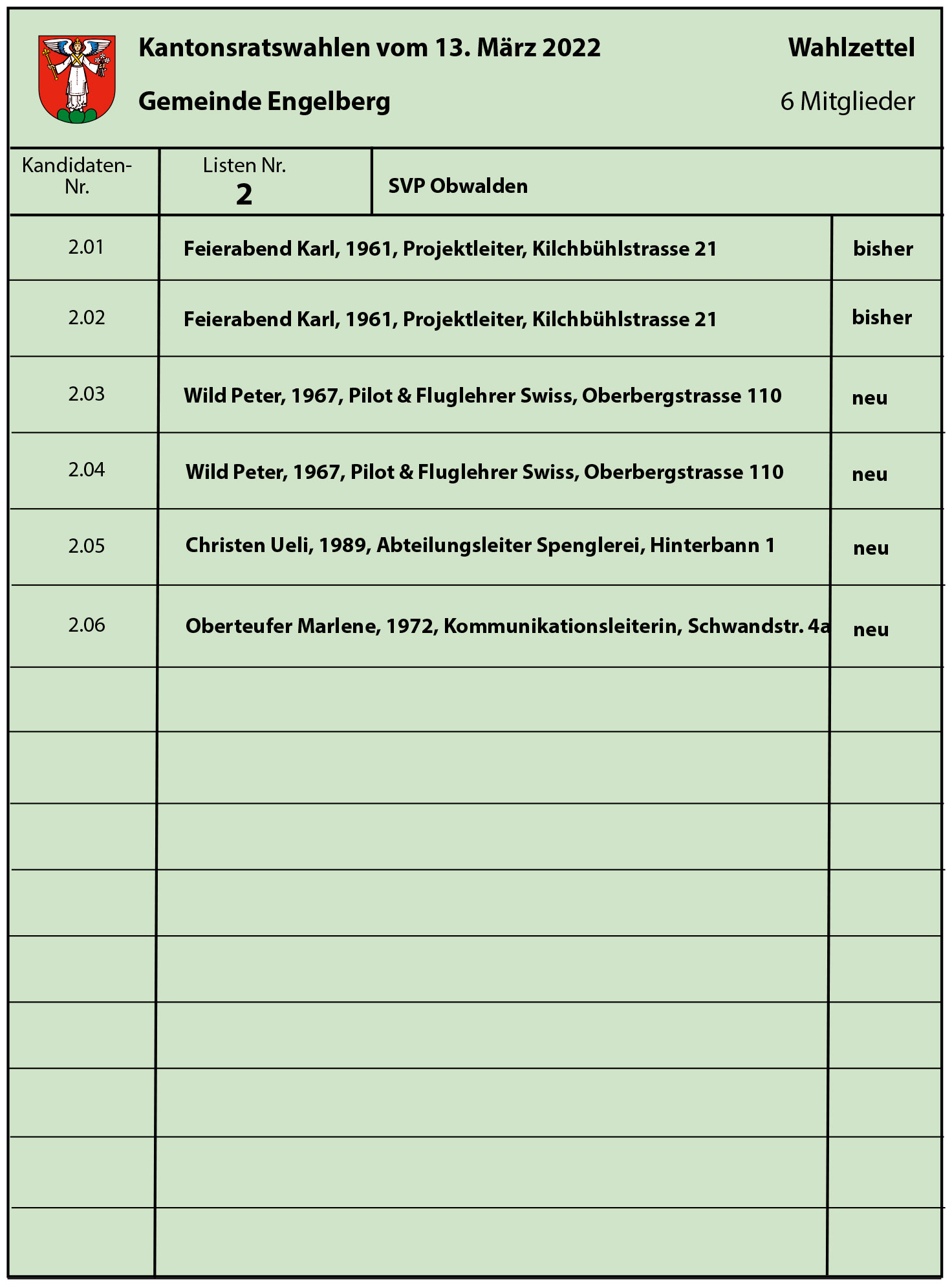 Kari Feierabend (bisher), Jg. 1961 ist gelernter Baumaschinenführer und Sprengmeister. Als Ausbildner und Prüfungsexperte für den Spreng verband steht Kari dem Bau-, Kies- und Betongewerbe nahe. Seine Hobbys sind Fotografieren, Handwerken, Wandern und Reisen.